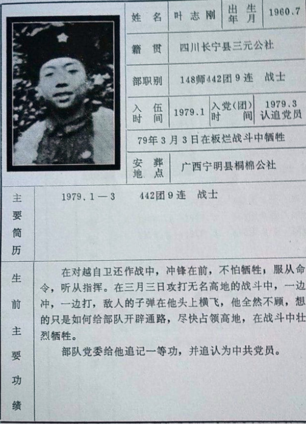 據(jù)了解,葉志剛烈士,四川省宜賓市長寧縣三元鄉(xiāng)人,1960年生,442團9連戰(zhàn)士,1979年3月在自衛(wèi)還擊保衛(wèi)邊疆作戰(zhàn)中英勇犧牲,年僅19歲。戰(zhàn)后部隊黨委給他追記一等功,追認(rèn)為中國共產(chǎn)黨黨員。七九自衛(wèi)還擊保衛(wèi)邊疆作戰(zhàn)時,張長順將軍時任原成都軍區(qū)司令部軍訓(xùn)部副部長,派駐148師工作組組長。戰(zhàn)后四十多年來,張將軍一直在牽掛著葉志剛烈士,一直在尋找烈士的親人,目的是為了兌現(xiàn)當(dāng)初面對烈士遺體作出的一個承諾!