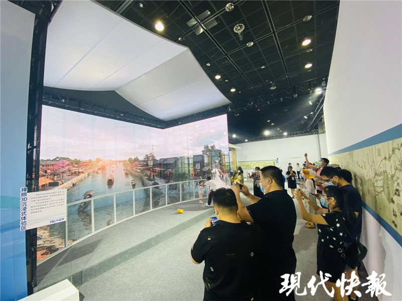 展區(qū)中央,由現(xiàn)代快報團隊制作的國內(nèi)首部運河裸眼3D視頻,正在巨幅冰屏上播放,十分吸睛。站在冰屏前,運河兩岸的煙火氣息觸手可及,大運河的前世今生仿佛在此交融。運河人家、美食美景、千年文脈、河水悠悠,一切都是那么生動,讓人沉浸其中。