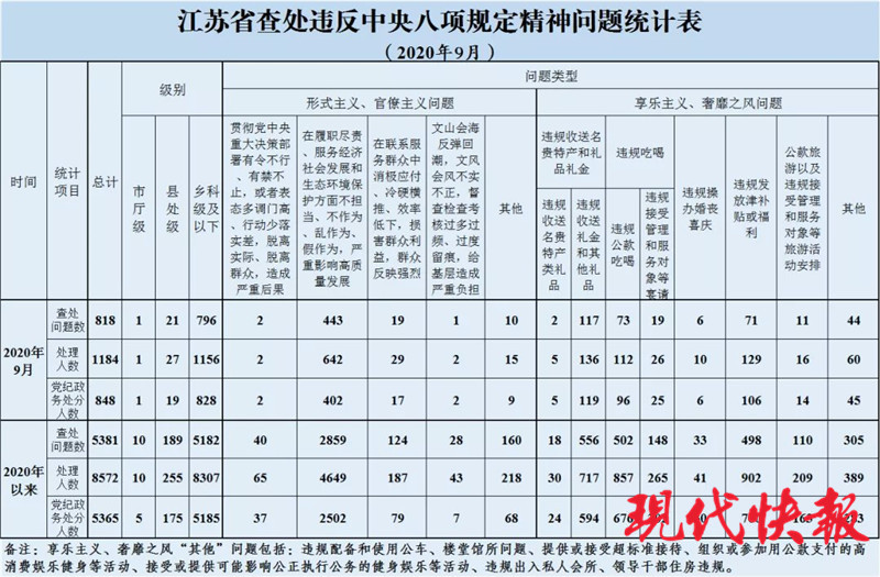 10月22日,現(xiàn)代快報記者了解到,2020年9月,全省共查處違反中央八項規(guī)定精神問題818起,處理1184人,其中給予黨紀政務處分848人。從問題類型看,查處形式主義、官僚主義問題475起、處理690人,查處享樂主義、奢靡之風問題343起、處理494人。從人員級別看,處理市廳級干部1人、縣處級干部27人、鄉(xiāng)科級及以下人員1156人。(圖片來源:清廉江蘇)