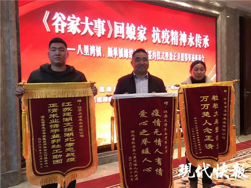 “老徐一家捐贈的大米,為我鎮(zhèn)打贏疫情阻擊戰(zhàn)提供了強力支持,體現了大家庭的溫暖。”在現場,湖北黃岡市紅安縣八里灣鎮(zhèn)鎮(zhèn)長李順祥介紹了當地上下一心共同抗疫的事跡,表達對徐正青一家的感激之情,同時與建湖縣顏單鎮(zhèn)締結為友好鎮(zhèn)。