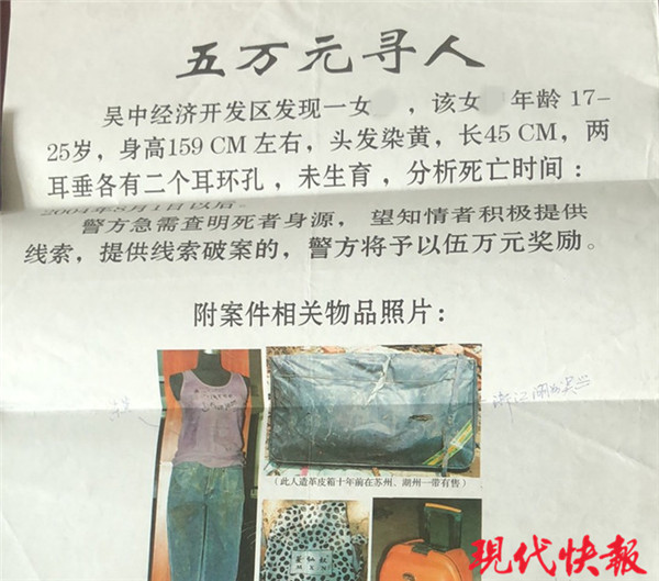 “為了確定受害人身份,有重合度的失蹤警情都溯源調(diào)查,近三個月的糾紛類警情都挨個回訪。每個參戰(zhàn)民警的筆記本、公文袋里都有一張啟事隨時對照,登報發(fā)啟事、做客新聞節(jié)目,能想到的方法也都用上了。”時任南區(qū)派出所刑偵副所長的張全弟回憶。