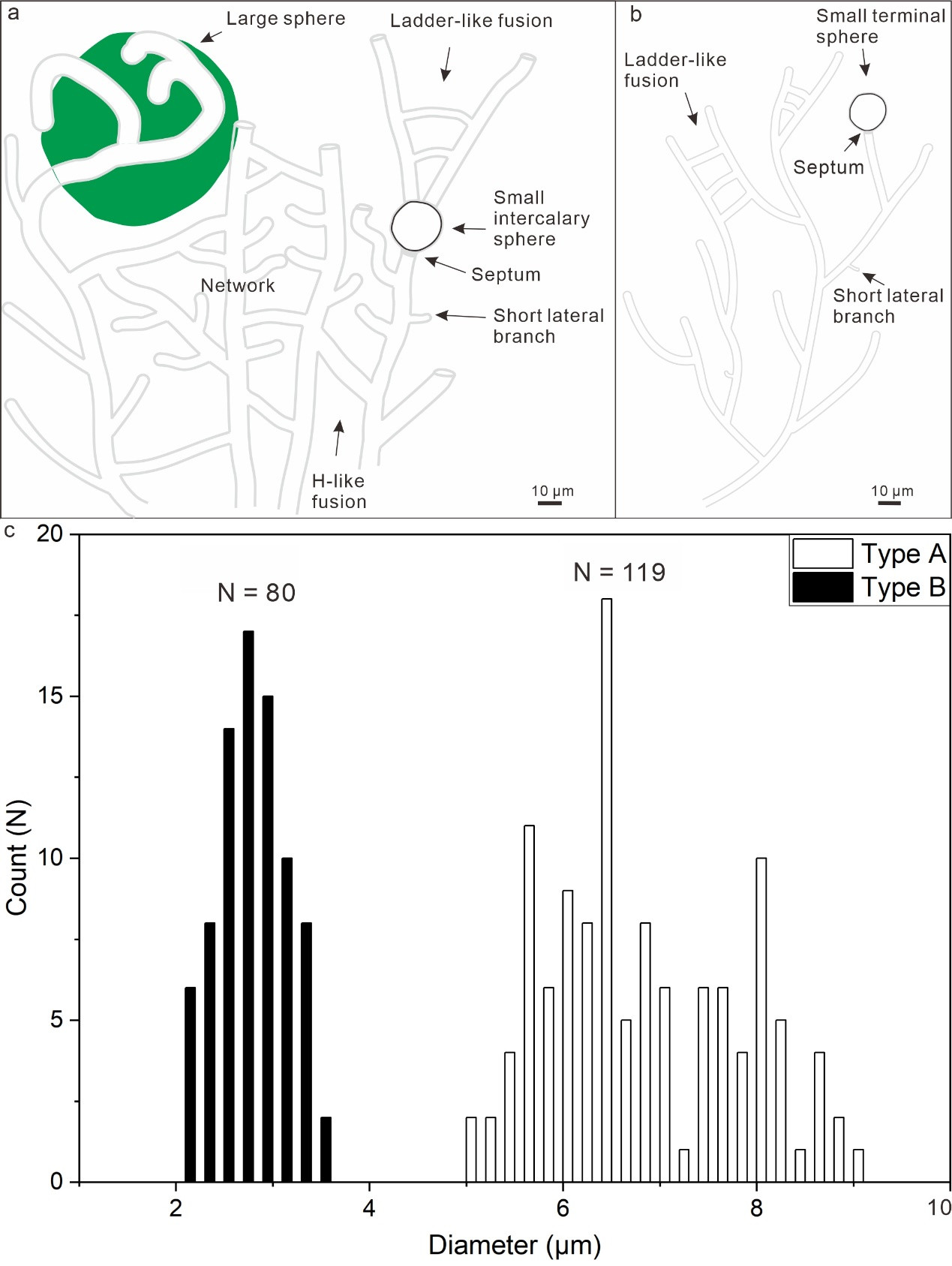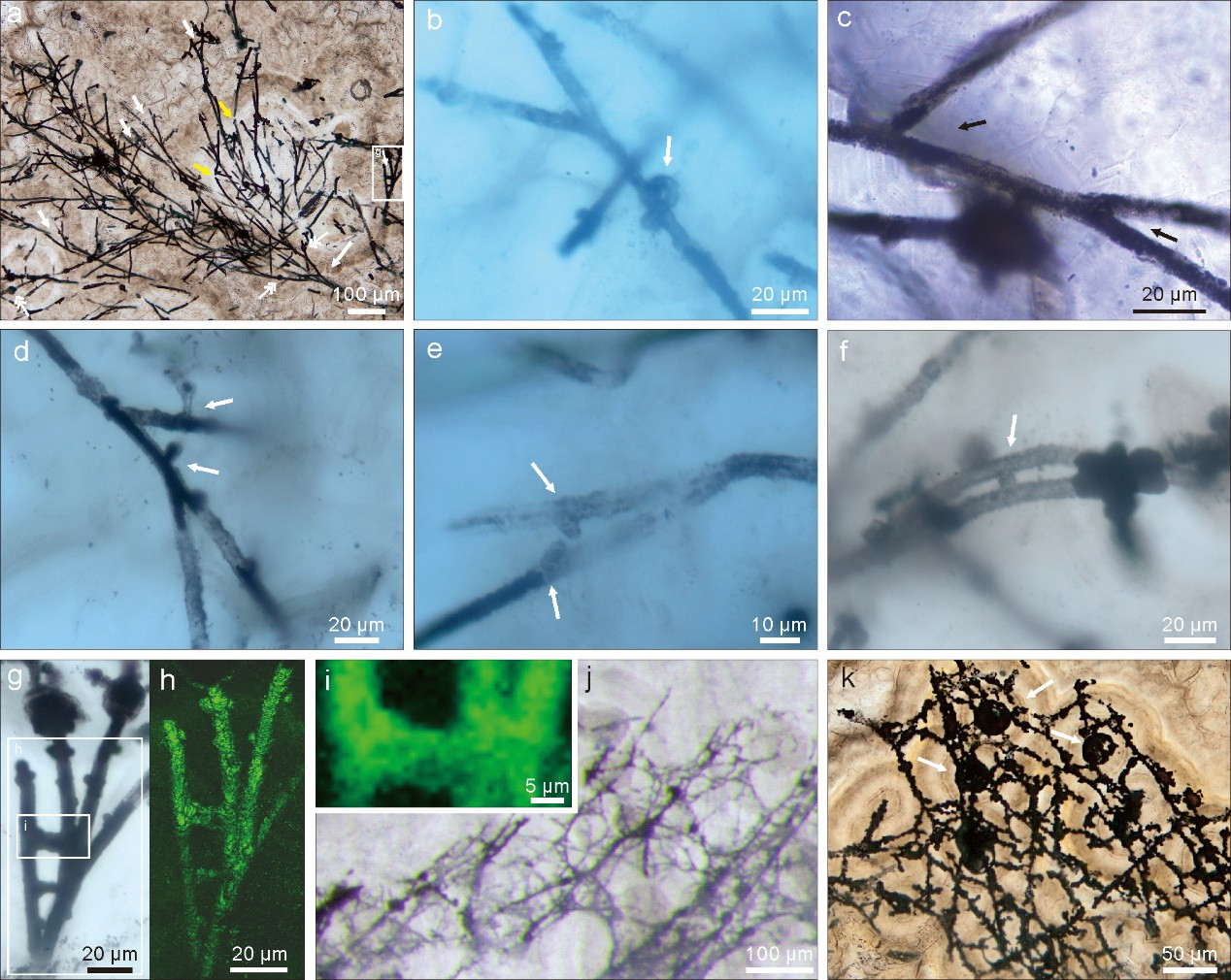 “我們發(fā)現(xiàn)6.3億年前的這種遠(yuǎn)古真菌類化石主要由兩部分構(gòu)成。一部分是長度數(shù)百微米的空心細(xì)絲,另一部分是連接在細(xì)絲之間、直徑10至26微米的空心小球。”研究團(tuán)隊(duì)通過與現(xiàn)代類似真菌的比對推測,細(xì)絲可能是真菌類生物的菌絲,而空心小球可能是用于繁殖的無性孢子。
