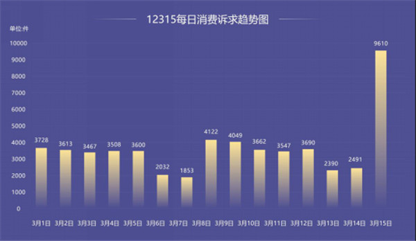 3月15日當(dāng)天,全省12315熱線平臺(tái)接收消費(fèi)者訴求9610件,占3·15期間受理總量的17.37%,同比上升33.47%。3月15日當(dāng)天的單日受理量位居首位,是3·15期間其他時(shí)間段單日受理量的兩倍。