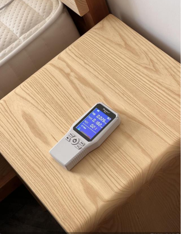 據黃女士介紹,為了能盡快入住,她已經開窗通風了幾個月,但仍然不太放心。由于黃女士長期在外教學和演出,很少回新家住,為了測試家具中的甲醛是否完全散去,在前一天晚上將窗戶全部封閉了12個小時,再將甲醛檢測儀放在厭式房間的家具上,結果顯示床頭柜的甲醛數值達到了0.299mg/m³,TVOC(總揮發(fā)性有機化合物)的數值達到了2.401mg/m³;餐桌的甲醛釋放量達到了0.32mg/m³,TVOC(總揮發(fā)性有機化合物)的數值達到了3.533mg/m³。床頭柜和餐桌的甲醛含量分別超標2.4倍和2.5倍,AQI(空氣質量指數)顯示均為“輕度污染”。