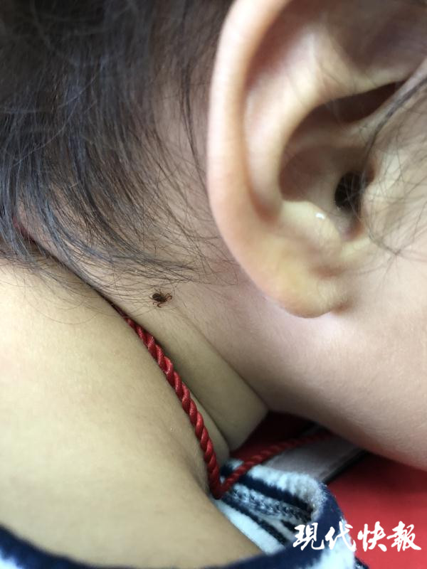 “上周六早上,我給貝貝換衣服的時(shí)候,發(fā)現(xiàn)她的脖子突然冒出一顆‘黑痣’,而且這個(gè)‘黑痣’居然會(huì)動(dòng)。”貝貝媽媽回憶起發(fā)現(xiàn)蜱蟲的過(guò)程,仍心有余悸,“后來(lái)我們仔細(xì)一看,原來(lái)是一只八只腳的蟲子,頭都鉆進(jìn)皮膚里面了。”