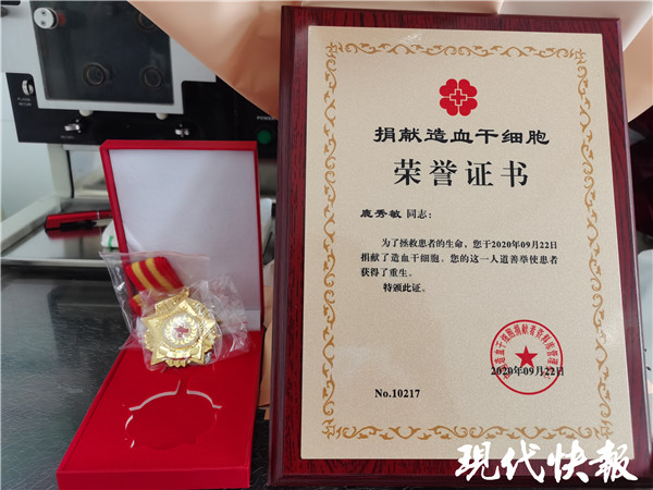 △ 捐獻(xiàn)造血干細(xì)胞榮譽(yù)證書和獎?wù)?/p>