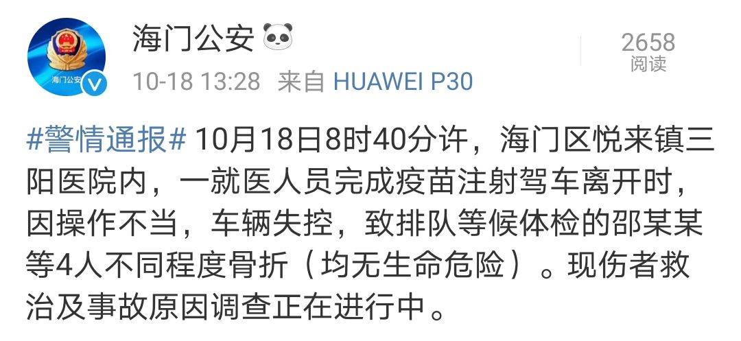 當(dāng)日,海門公安通過(guò)官方微博發(fā)布警情通報(bào)。通報(bào)內(nèi)容顯示,10月18日8時(shí)40分許,海門區(qū)悅來(lái)鎮(zhèn)三陽(yáng)醫(yī)院內(nèi),一就醫(yī)人員完成疫苗注射駕車離開(kāi)時(shí),因操作不當(dāng),車輛失控,致排隊(duì)等候體檢的邵某某等4人不同程度骨折(均無(wú)生命危險(xiǎn))。目前傷者救治及事故原因調(diào)查正在進(jìn)行中。