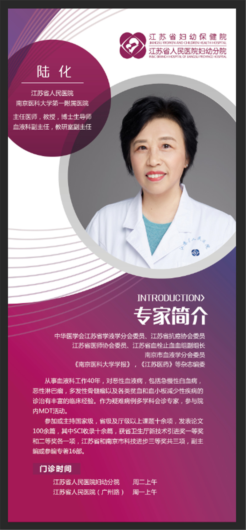 自2021年1月19日,江蘇省婦幼保健院、江蘇省人民醫(yī)院婦幼分院血液病門診已正式開診,由江蘇省人民醫(yī)院血液科陸化主任醫(yī)師定期坐診。陸化主任是省內(nèi)血液病治療領(lǐng)域的知名專家,從事血液科工作40年,對(duì)惡性血液病,包括急慢性白血病,惡性淋巴瘤,多發(fā)性骨髓瘤以及各類貧血和血小板減少性疾病的診治有著豐富的臨床經(jīng)驗(yàn),同時(shí)是江蘇省人民醫(yī)院疑難病例會(huì)診專家。