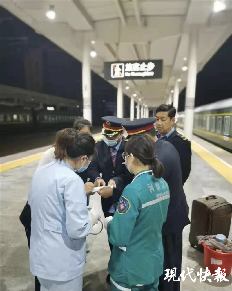 22時25分,列車長馬健考慮商丘站是大站,醫(yī)療設(shè)備好,遂與商丘站取得聯(lián)系,并為旅客安排120急救車。