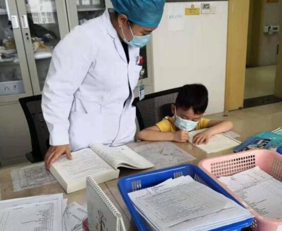 “每天都在小小的值班室,兒子有時(shí)候會(huì)鬧情緒,今天上午都哭了兩次了,說一個(gè)人孤獨(dú)害怕。”王珂瑋雖然很心疼,但還是把更多的時(shí)間和精力放在病人身上,只有在吃飯的時(shí)候才擠出時(shí)間陪兒子玩。為了讓兒子能夠安靜地待在值班室里,王珂瑋也買了語文和數(shù)學(xué)練習(xí)冊(cè)給兒子做,空閑的時(shí)候也會(huì)親自輔導(dǎo)孩子。