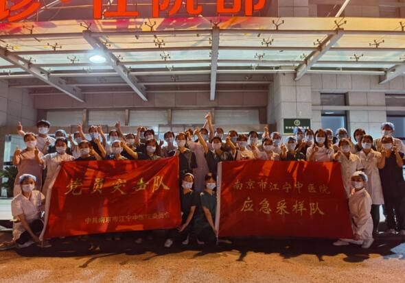 7月23日凌晨5點,整個城市還在睡夢中的時候,江寧中醫(yī)院住院部樓前240名醫(yī)護人員已經(jīng)集合完畢,將要奔赴屬于他們的“主陣地”——江寧祿口街道,第二輪核酸采集工作即將開始。在住院部燈光的映襯下鮮紅的旗幟顯得格外耀眼。