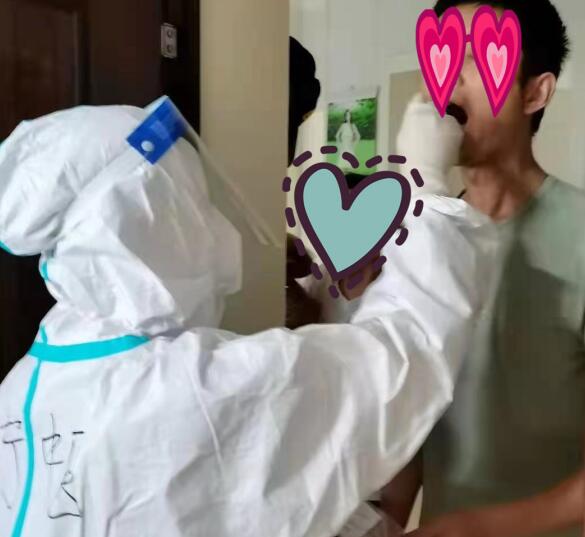 下午的任務(wù)更加艱巨,需要上門進(jìn)行核酸采集,大家快速解決午飯、補充水分后就開始行動了。根據(jù)分配的名單信息,王維在志愿者的幫助下挨家挨戶地上門確認(rèn),她所負(fù)責(zé)的區(qū)域是一棟六層樓的老小區(qū),共四個單元,沒有電梯,需要一層一層地爬上去,再爬下來,再上去,如此周而復(fù)始。六層樓不斷來回爬本就是極其消耗體力的,再加上當(dāng)天悶熱的天氣、密不透風(fēng)的防護服讓她的體力基本處于透支狀態(tài),濕透的褲子裹住雙腿,邁開的步伐越來越沉重,終于爬上六樓時,她感覺腦袋都要炸開了,開始耳鳴聽不清別人說的話,她靠在欄桿上,感覺自己的雙腿不停地發(fā)抖,她艱難地告訴志愿者讓家里的老奶奶稍等一下,她要歇一歇。此時屋內(nèi)等候采集的老奶奶也察覺出王維的不適了,要讓她進(jìn)屋休息一下,可此時身穿防護服的王維知道這是絕對不行的,在疫情面前不能絲毫懈怠,她搖了搖頭,老人家就貼心地將家里的電風(fēng)扇轉(zhuǎn)了個方向,對著王維吹,看著老奶奶忙前忙后,雖然電風(fēng)扇的風(fēng)吹不進(jìn)她的防護服,卻吹進(jìn)了她的心里,讓疲憊不堪的王維突然感到了一絲涼意。休息過后王維的體力稍有了恢復(fù),頭疼也有了緩解,于是她完成了老奶奶的核酸采集。