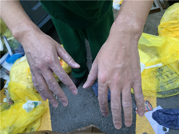 白天烈日當(dāng)頭下的工作,和上門采集工作是最辛苦的。摘下口罩,口罩里可以倒出水。反復(fù)濕透反復(fù)曬干的衣服,可以清晰看到鹽漬的紋路。大家會比誰的鹽漬紋路更藝術(shù)更漂亮,仿佛那是披在身上的鎧甲。