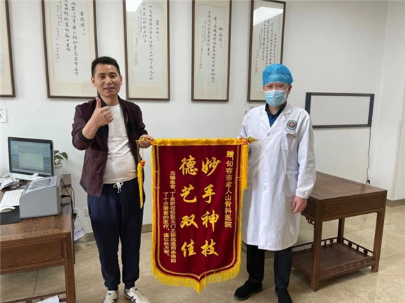 家住溧陽的葉先生,2021年6月的一天,在采摘楊梅時(shí)不慎跌傷致左大腿腫脹、疼痛,不能站立行走,活動(dòng)后疼痛加重。經(jīng)朋友介紹來老人山醫(yī)院治療。7月1日進(jìn)行了左股骨中下段粉碎性骨折切開復(fù)位內(nèi)固定術(shù),術(shù)后恢復(fù)情況良好,一周后出院,返回家中靜養(yǎng),現(xiàn)在已完全康復(fù),高興之余,特地讓家人給程保加主治醫(yī)師送來錦旗,上寫:“程氏骨科,名不虛傳!”
