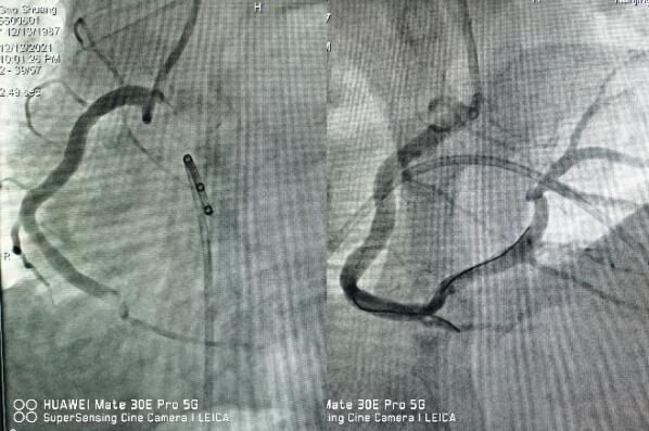 醫(yī)生立即予以搶救,并第一時間通知心內(nèi)科值班醫(yī)師,緊急啟動綠色通道,全院相關(guān)科室全力配合,心內(nèi)科介入團隊分工明確,迅速啟動導(dǎo)管室。因患者心梗后并發(fā)嚴重心律失常,為了安全起見,造影前植入臨時起搏器,造影提示右冠狀動脈急性完全閉塞,并成功開通血管,患者胸痛即刻緩解,目前正在康復(fù)過程中。