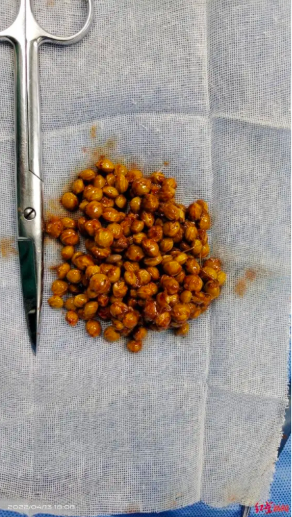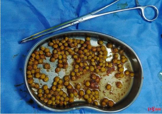 經檢查,患者需進行肛門直腸異物取出術。手術中,醫(yī)生取出了上百顆櫻桃核。由于患者吞食的體量較大,腸道尚還殘留櫻桃籽,4月14日,醫(yī)生為此進行了第二次手術,取出的櫻桃核比第一次還要多。