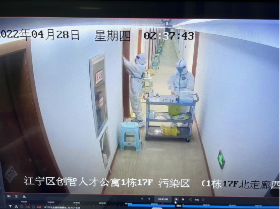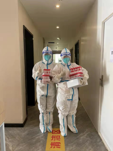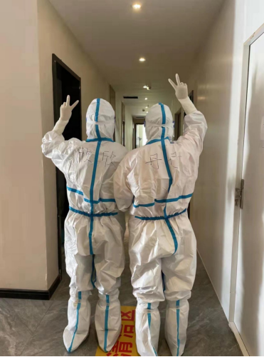 由于創(chuàng)智人才公寓隔離點(diǎn)接收的上海外轉(zhuǎn)人員眾多,有時(shí)一天下來就要接收300多人,工作強(qiáng)度很大,劉欣和徐世丹常常累得腿都抬不起來。每天一大早,從房間配置、人員配備、醫(yī)廢、人員轉(zhuǎn)運(yùn),再到消殺、垃圾閉環(huán)處置等,劉欣和徐世丹沒有停下過忙碌的腳步。她們?nèi)諒?fù)一日按流程工作,不放過任何一個(gè)細(xì)節(jié)。同時(shí)時(shí)刻和群里的隔離人員溝通,保障他們的正常生活。一天,徐世丹剛剛采集完核酸回到房間,忽然聽見手機(jī)在響,接聽后了解到一位母親正急匆匆地給11歲的女兒尋找生理用品,她迅速穿好防護(hù)服將所需物品親自送到母親手中,“謝謝你,太感謝了!”徐世丹卻表示,“您的感謝,才是我們工作的動(dòng)力。”在到達(dá)創(chuàng)智人才公寓之前,徐世丹已經(jīng)在其他隔離點(diǎn)工作一個(gè)多月了,上一段工作結(jié)束之后,她緊接著又來到這里,繼續(xù)她的抗“疫”之路。
