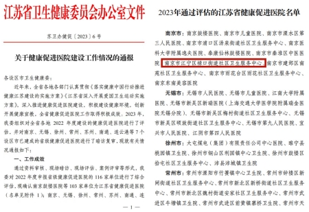近日,江蘇省衛(wèi)生健康委員會通報了2023年度省級健康促進醫(yī)院建設情況,喜報傳來,江寧區(qū)祿口社區(qū)醫(yī)院通過評估,成功榮獲“江蘇省健康促進醫(yī)院”。