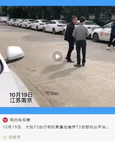 網(wǎng)約車觀察,10月19日,大批T3出行司機聚集在南京T3總部抗議平臺新政策