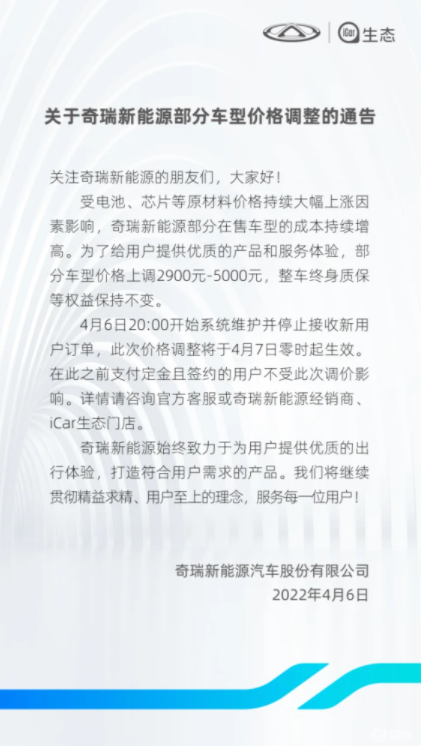 上調(diào)2900-5000元 奇瑞新能源部分車型4月7日起調(diào)價