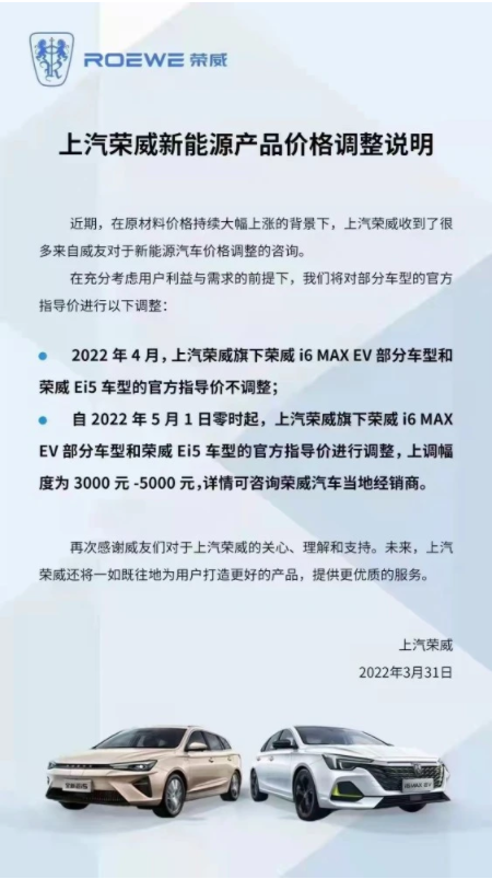 就在3月這波漲價中,相對而言也有讓消費者更加舒服的汽車品牌,打開了正確的消費者相處模式,給足了一個月的緩沖期,可謂是新能源車主入購愛車的“高光時刻”。據(jù)了解就在3月31日上午,上汽榮威官方發(fā)布了榮威新能源產(chǎn)品價格調(diào)整公告,顯示4月上汽榮威新能源車型不漲價,5月起開始漲價,價格上調(diào)3000-5000元。翻譯過來就是,榮威新能源給大家留了一個月的選購窗口期,如果你不想留下遺憾,就不要錯過4月購車這個最佳時間點了。
