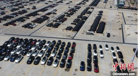 4月21日,剛下生產(chǎn)線的國產(chǎn)特斯拉正一輛輛有序停在工廠內(nèi)。 殷立勤 攝