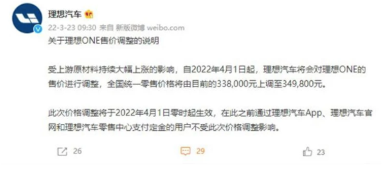 一方面,理想ONE在4月份進(jìn)行了一次大幅度的調(diào)價,價格上漲幅度達(dá)到了1萬多,由于原材料價格上漲,幾乎所有新能源車型都在漲價,這其實可以理解。在理想汽車針對價格上漲的原因作出的回復(fù)中也表示,電池原材料成本上調(diào)導(dǎo)致價格上漲是最大的因素。 不過理想ONE作為增程式電動汽車,其實使用的電池包容量并不是很大,1萬多的漲價幅度著實有些夸張了。而且理想汽車在3月23日宣布, 4月1日起就迫不及待正式漲價了。