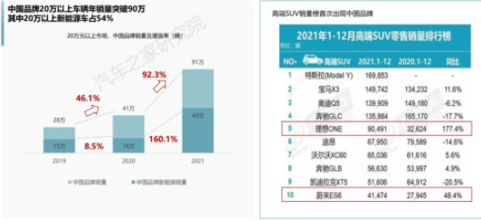 價格是支撐中國品牌向上的基石,隨著中國品牌持續(xù)向高端化進(jìn)軍,豪華車市場逐漸有了中國品牌的身影。汽車之家研究院統(tǒng)計數(shù)據(jù)顯示,2021年,中國品牌20萬以上車輛年銷量突破90萬輛。其中,20萬元以上的中國品牌新能源汽車占比達(dá)54%
