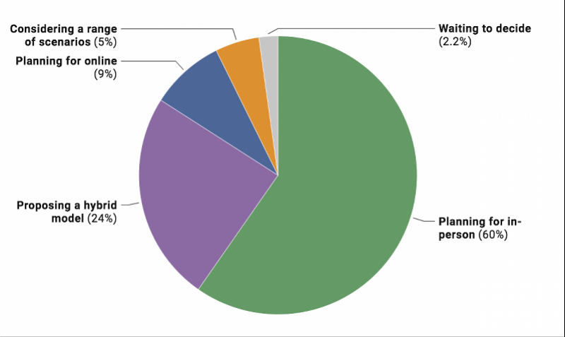 根據(jù)美國《高等教育紀(jì)事報(bào)》對(duì)1090所美國大學(xué)和學(xué)院的統(tǒng)計(jì),60%的學(xué)校計(jì)劃在秋季學(xué)期重啟線下教學(xué),24%的學(xué)校擬采用混合教學(xué)模式。9%的學(xué)校計(jì)劃給學(xué)生上網(wǎng)課,其中不乏哈佛大學(xué)這樣的名校。
