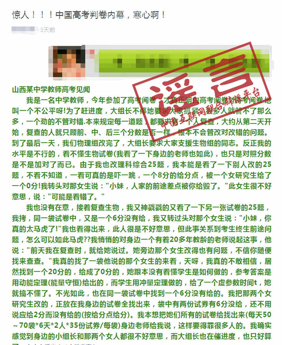 謠言3:某地高考閱卷老師冒死揭露閱卷內(nèi)幕
