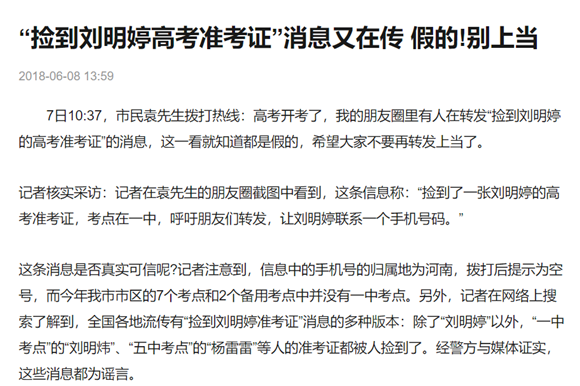辟謠文章:“撿到劉明婷高考準(zhǔn)考證”消息又在傳 假的!別上當(dāng)