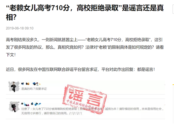 辟謠文章:“老賴(lài)女兒高考710分,高校拒絕錄取”是謠言還是真相?