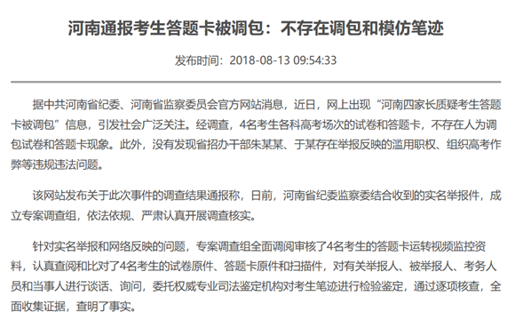 辟謠文章:河南通報(bào)考生答題卡被調(diào)包:不存在調(diào)包和模仿筆跡