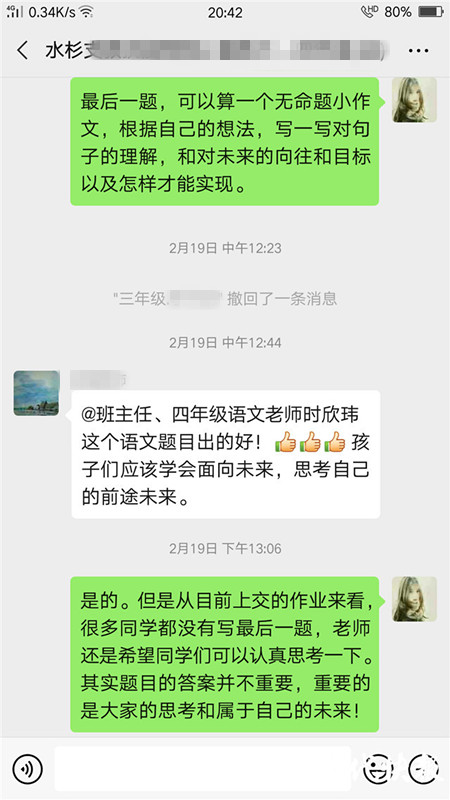 “云支教”活動(dòng)一開始招募,作為上一屆支教志愿者的時(shí)欣瑋立即報(bào)名加入。她是南京林業(yè)大學(xué)風(fēng)景園林學(xué)院大三學(xué)生,期間擔(dān)任了三、四年級(jí)班主任兼四年級(jí)語文老師,給去年暑假支教時(shí)教過的孩子進(jìn)行線上輔導(dǎo)。在2月15日至3月14日,時(shí)欣瑋通過微信群聊的方式布置作業(yè),并單獨(dú)輔導(dǎo)近30位同學(xué)的學(xué)習(xí),批改了近千份作業(yè),為他們答疑解惑,直至當(dāng)?shù)氐睦蠋焸冮_始線上教學(xué)。