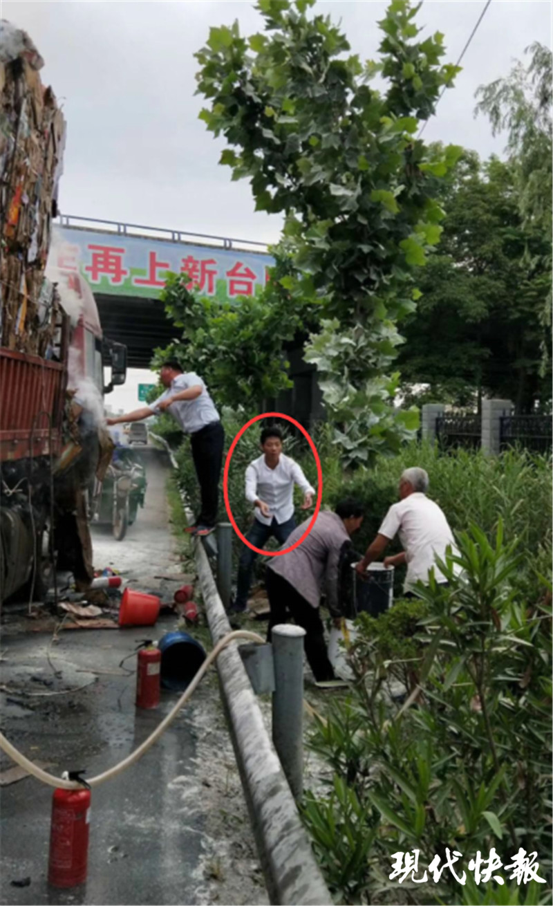 到了現(xiàn)場(chǎng),王維立即從路邊的小溝中拎水開(kāi)始滅火,見(jiàn)火勢(shì)沒(méi)有減小,王維又跑回家中取來(lái)小水泵,用電動(dòng)車(chē)的電瓶作為電源進(jìn)行打水滅火,王維的爸爸王開(kāi)銀看到兒子忙著救火,也隨即帶上家里備用的4只滅火器投入“戰(zhàn)斗”。后來(lái),當(dāng)?shù)叵篮兔窬s到現(xiàn)場(chǎng),在大家的幫助下,大貨車(chē)上的火終于被撲滅。