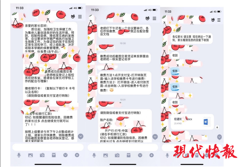 現(xiàn)代快報記者從常州市反詐騙中心了解到,8月28日,黃先生向派出所報案稱,QQ班級群內(nèi)“班主任”發(fā)布通知稱新學(xué)期要交費,包含學(xué)雜費、伙食費、保教管理費等,需要按照通知要求操作付款并截圖發(fā)給老師統(tǒng)計,群里另一位老師也出言附和。