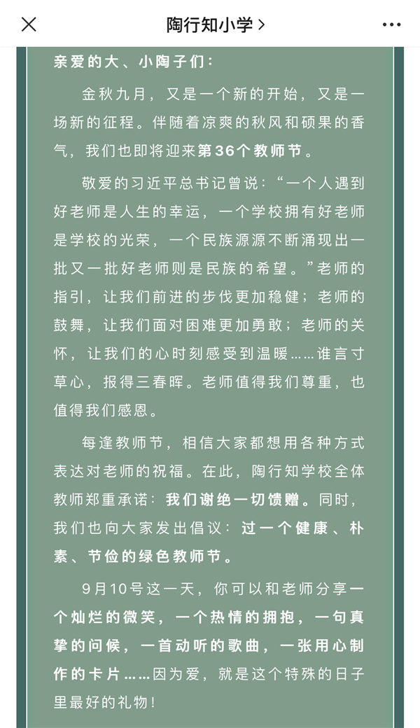 “每逢教師節(jié),相信大家都想用各種方式表達(dá)對(duì)老師的祝福。在此,陶行知學(xué)校全體教師鄭重承諾:我們謝絕一切饋贈(zèng)。同時(shí),我們也向大家發(fā)出倡議:過(guò)一個(gè)健康、樸素、節(jié)儉的綠色教師節(jié)。9月10號(hào)這一天,你可以和老師分享一個(gè)燦爛的微笑,一個(gè)熱情的擁抱,一句真摯的問(wèn)候,一首動(dòng)聽(tīng)的歌曲,一張用心制作的卡片……因?yàn)閻?ài),就是這個(gè)特殊的日子里最好的禮物!”