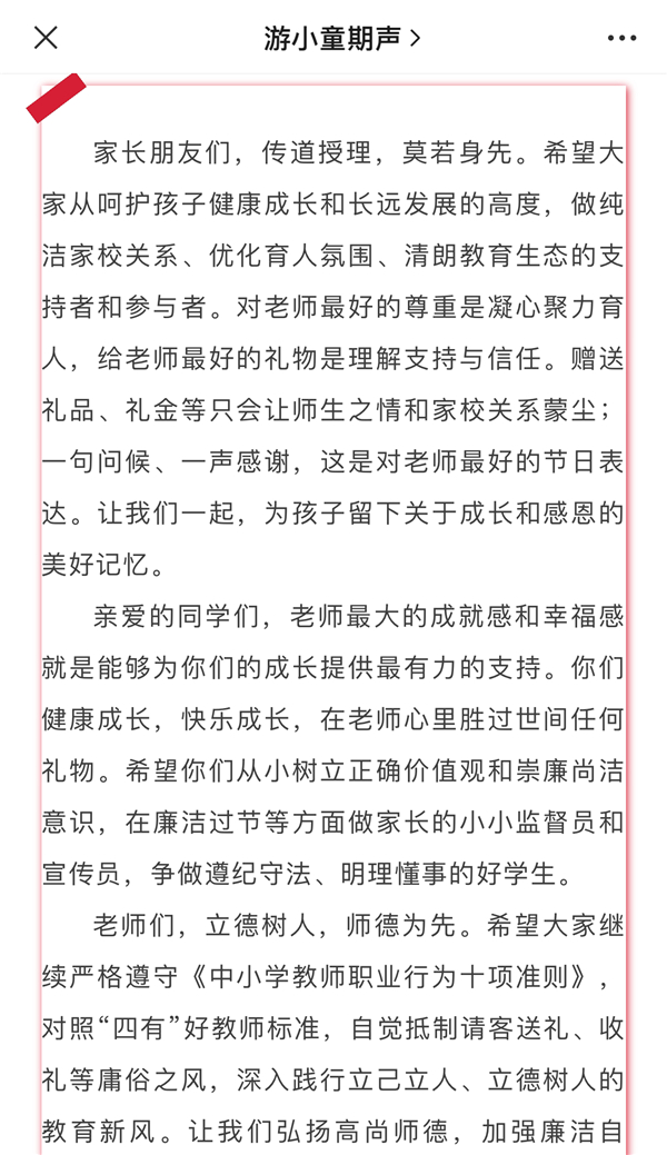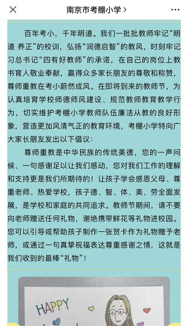 “尊師重教是中華民族的傳統(tǒng)美德,您的一聲問(wèn)候、一句感謝足以讓我們感動(dòng),您對(duì)我們工作的理解和支持更是我們所期待的!讓孩子學(xué)會(huì)感恩父母、尊重老師、熱愛(ài)學(xué)校,孩子德、智、體、美、勞全面發(fā)展,是學(xué)校和家庭的共同追求。教師節(jié)期間,請(qǐng)不要向老師贈(zèng)送任何禮物,謝絕攜帶鮮花等禮物進(jìn)校園。您可以引導(dǎo)或幫助孩子制作一張賀卡作為禮物贈(zèng)予老師,或通過(guò)一句真摯祝福表達(dá)尊重感謝之情,這就是我們收到的最棒‘禮物’!”