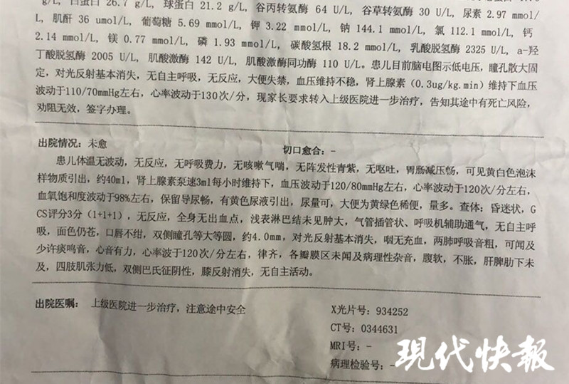醫(yī)院診斷報(bào)告顯示,文文和瑞瑞于8點(diǎn)至10點(diǎn)30分之間被鎖車內(nèi)。被發(fā)現(xiàn)時(shí),兩個(gè)孩子“全身衣物濕透,面部潮紅,呼之不應(yīng),四肢癱軟”。其中,哥哥文文被診斷患有熱射病、腦病和應(yīng)激性高血糖。弟弟瑞瑞的狀況則較為嚴(yán)重,且持續(xù)昏迷不醒。醫(yī)生當(dāng)場(chǎng)就開出了兩份病危通知書。