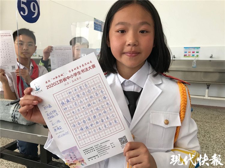 “孩子們抬頭挺胸,端正坐姿,正確握筆,一筆一畫書寫。”鹽城市新河實驗小學的書法老師家徐萬虎和萬遠峰、費建、蔡紅梅等四位老師穿梭其中,指導孩子們認真比賽。“媽媽很支持我,我每天都會抽時間練字。”四年級的學生孫雨婷雖然才練字1年時間,但她的字已顯成熟穩(wěn)重。