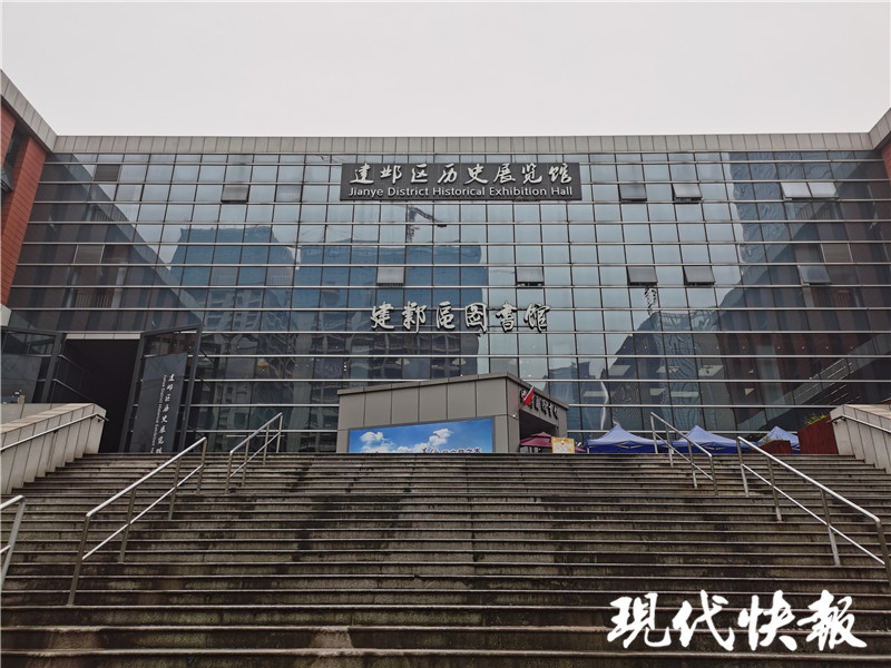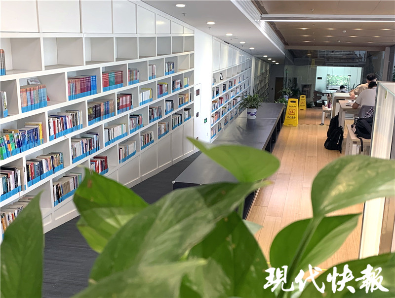 沿著高高的臺(tái)階,走上建鄴區(qū)圖書館二樓,現(xiàn)代化的玻璃幕墻包裹下,里面是一個(gè)設(shè)計(jì)風(fēng)格雅致的閱讀空間。
