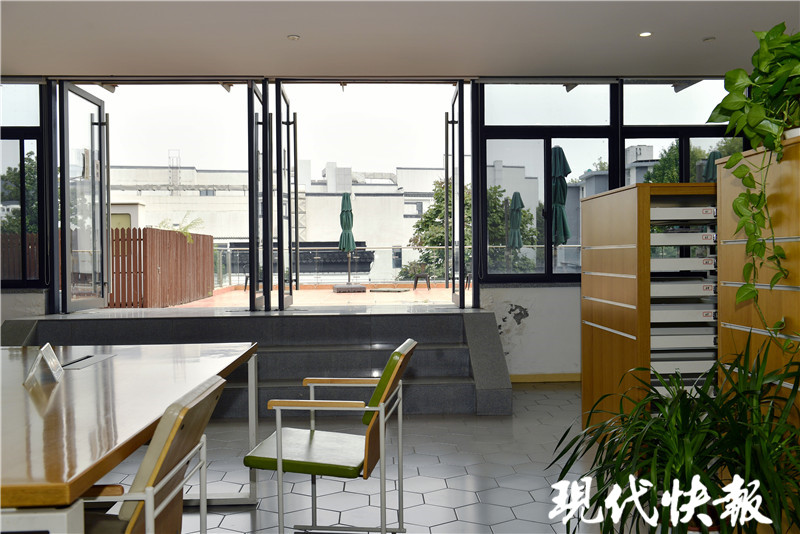 這里最讓人心動(dòng)的,是閱讀區(qū)外一片開闊露臺(tái)。低頭,是隱隱帶著墨香的書籍,耳邊有蟬鳴鳥啼,和風(fēng)吹動(dòng)的梧桐葉;抬頭,是青磚黛瓦的江南建筑,梧桐樹蒼綠的頂冠與視線齊平。傍晚的時(shí)候,落日熔金,暮云合碧,沿著天際線遠(yuǎn)望,是長(zhǎng)不見尾的街巷。