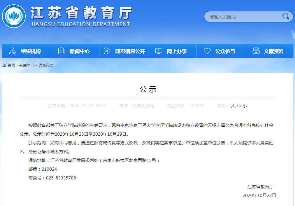 (記者 舒越)10月25日,現(xiàn)代快報(bào)記者從江蘇省教育廳官網(wǎng)獲悉,南京信息工程大學(xué)濱江學(xué)院將轉(zhuǎn)設(shè)為獨(dú)立設(shè)置的無錫市屬公辦普通本科高校,正在公示期,公示時(shí)間截至10月29日。這意味著江蘇省將新增一所公辦高校,也是繼江南大學(xué)之后,地處無錫的第二所公辦普通本科高校。