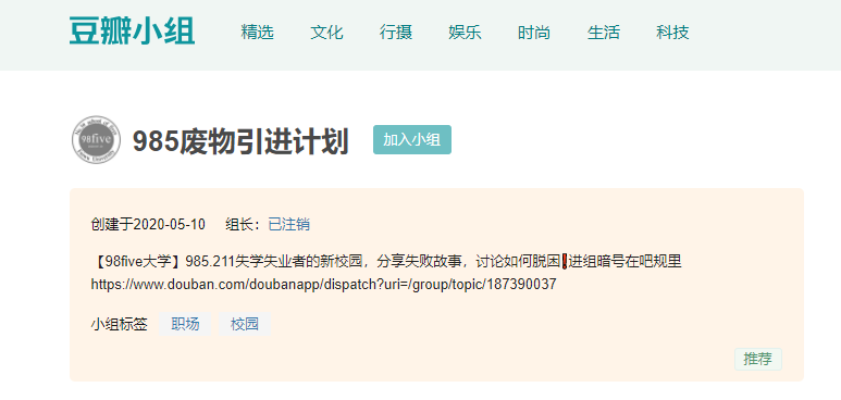 5月,一位上海大學(xué)生在豆瓣上創(chuàng)建了名為“985廢物引進(jìn)計(jì)劃”的討論小組。這個(gè)小組的簡(jiǎn)介只有一句話:“985、211失學(xué)失業(yè)者的新校園,分享失敗故事,討論如何脫困。”該討論小組在兩個(gè)月內(nèi)就吸引了8萬(wàn)多人加入,且數(shù)字一直上升。