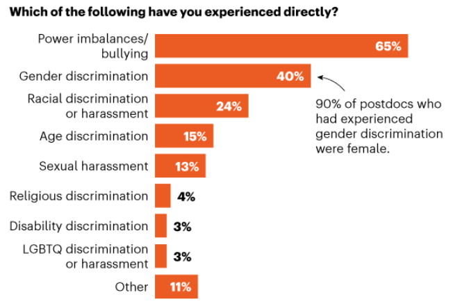 調(diào)查數(shù)據(jù)顯示,65%的博士后遭遇過職場PUA,40%的調(diào)查者遭遇過性別歧視,這其中90%為女性。