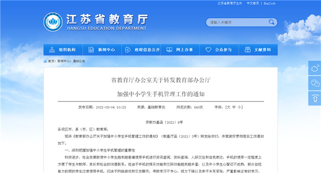 (記者 舒越)3月4日,江蘇省教育廳發(fā)布《關(guān)于轉(zhuǎn)發(fā)教育部辦公廳加強(qiáng)中小學(xué)生手機(jī)管理工作的通知》(以下簡(jiǎn)稱《通知》)。其中提出,在廣泛征求意見建議的基礎(chǔ)上,制定符合學(xué)生身心發(fā)展特點(diǎn)、學(xué)習(xí)生活實(shí)際的手機(jī)管理實(shí)施方案,做到“六個(gè)明確”。