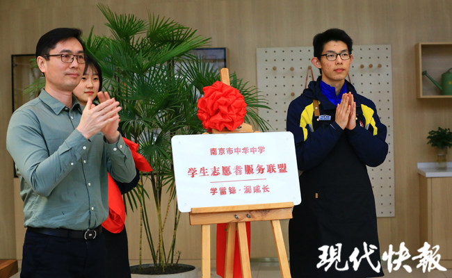陽光休閑區(qū)、閱讀區(qū)、園藝區(qū)……走進中華中學(xué)“新綠”植物書吧,一片綠意盎然,讓人心曠神怡。當(dāng)天,是植物書吧首次開放,在這里,“中華中學(xué)學(xué)生志愿者聯(lián)盟”也正式成立揭牌。