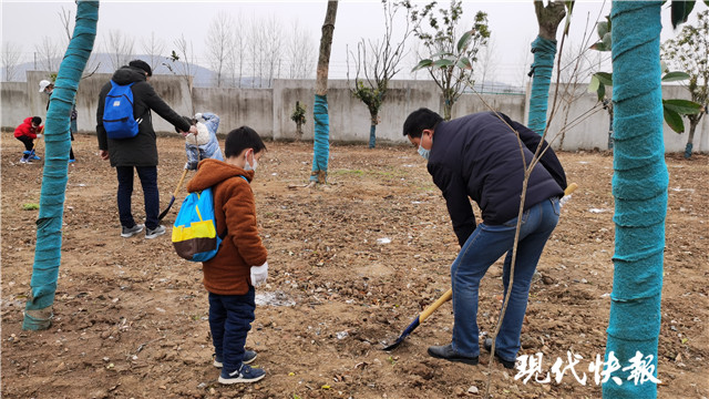 “樹苗扶穩(wěn)了哈,歪了的話就長不直!”“一點點填土,等會兒還要澆水哦!”解先生帶著7歲的兒子亮亮一起來植樹,這是他們第二次參加植樹活動。解先生把種樹的每一步驟都講解得很清楚,并且讓兒子參與進來。他告訴現(xiàn)代快報記者,植樹是很有意義的事情,可以讓孩子從小樹立保護環(huán)境的意識,“就是種樹可以給大自然增添綠色,美化環(huán)境,小鳥兒就可以在樹上筑窩安家。”