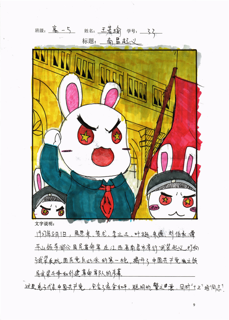 接到這份挑戰(zhàn),同學(xué)們都興趣高漲。高一(5)班王若瑜選擇了南昌起義這一歷史事件,主角是兩只眼里有五角星、緊握拳頭的“兔子”,象征著共產(chǎn)黨人胸懷堅(jiān)定信念。在完成這幅畫時(shí),王同學(xué)還查閱了很多資料,對這段歷史有了更全面、更深刻的理解。