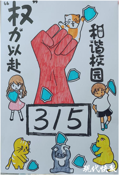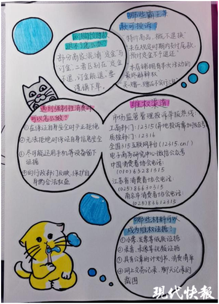 國際經(jīng)貿(mào)學(xué)院的同學(xué)們開展了“和諧校園,‘權(quán)’力以赴”主題活動,手繪出生動形象的消費者維權(quán)知識宣傳單。宣傳單的正中是一只拳頭,象征著消費者的“權(quán)”力。四周可愛的“國小貓”則是國貿(mào)院學(xué)子的象征。宣傳單的背面寫有“網(wǎng)購預(yù)付款退不了怎么辦”“哪些霸王條款可投訴”“哪些材料可以成為維權(quán)證據(jù)”等熱議話題,并給出了詳細解答,活動豐富了同學(xué)們有關(guān)消費者權(quán)益的知識。